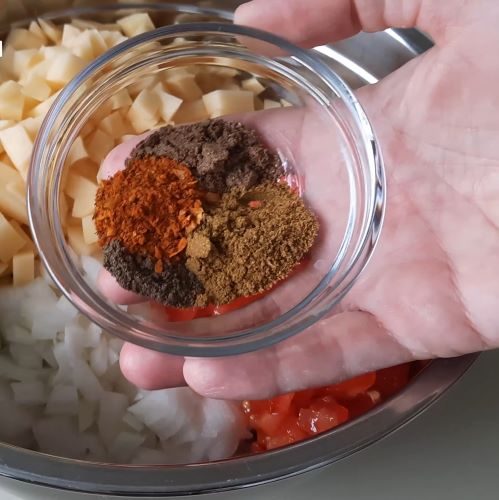 Специи любые, у меня: кориандр — 1 ч.л., хмели-сунели — 1 ч.л., перец черный — 1 ч.л., паприка — 1 ч.л., универсальная приправа для вторых блюд — 1 ч.л.