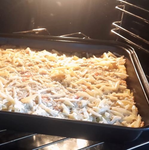 В форму для запекания выкладываем полученную «смесь», разравниваем и накрываем форму фольгой. В духовку на 30-35 минут при температуре 180 градусов.