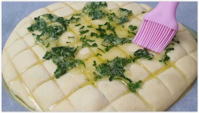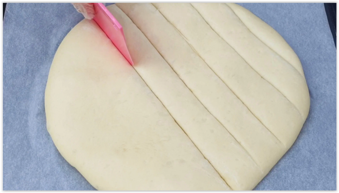 После расстойки делаем на тесте бороздки с помощью кулинарного шпателя. Должна получиться сеточка.