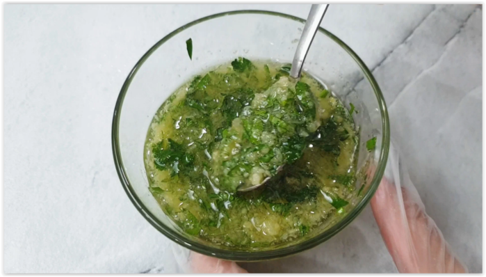 В миске смешиваем 100 мл оливкового масла, 3 измельченных чеснока и пол чайной ложки соли.
