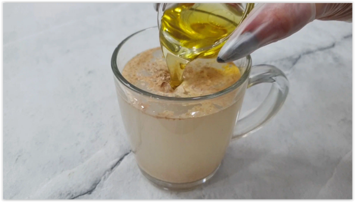 Вливаем 25 мл растительного масла и перемешиваем. Отставляем стакан в сторону.