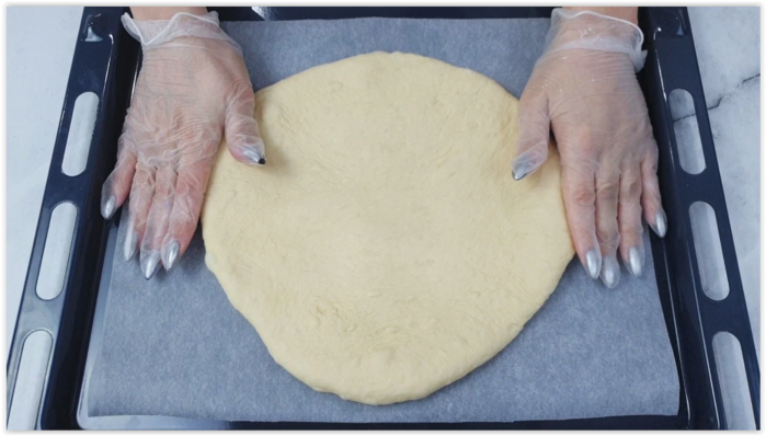 По истечении данного времени раскатываем тесто при помощи скалки в круг диаметром 25 см.
