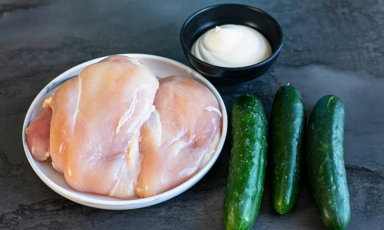 Куриную грудку отправляем в кипящую воду и варим до готовности. Огурцы чистим от кожуры и натираем на крупной терке. Сварившуюся курицу аккуратно разделяем на волокна, резать ее не нужно.