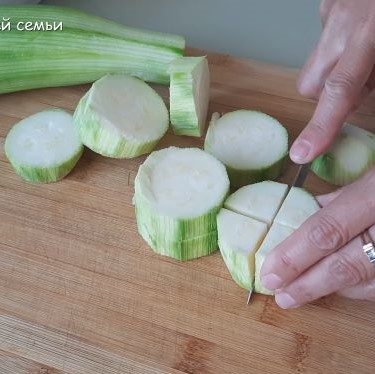 Берем молодые кабачки и нарезаем на слайсы толщиной около 7-10 мм. и еще делим на четыре части.