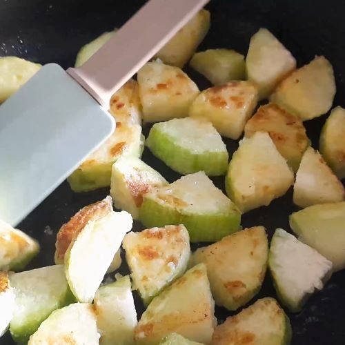 Прогреваем сковороду, наливаем растительное масло (достаточно 2-3 ст.л.), выкладываем кабачки и обжариваем примерно 3 минуты с каждой стороны (огонь средний). Обжаривала я все кабачки в два этапа.