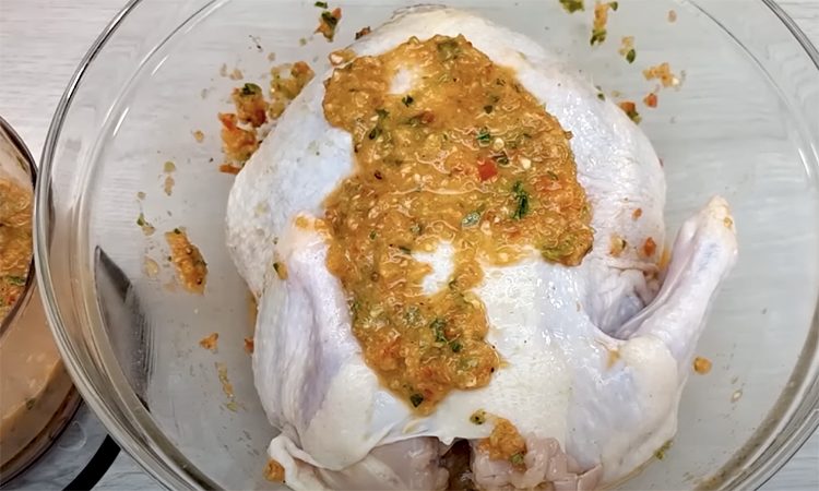Курицу промываем и раскрываем по центру, как для рецепта цыпленка тапака. Луковицу, перец, чеснок, петрушку и помидоры пюрируем в блендере. Затем добавляем к овощам растительное масло и специи, снова смешиваем все в блендере.