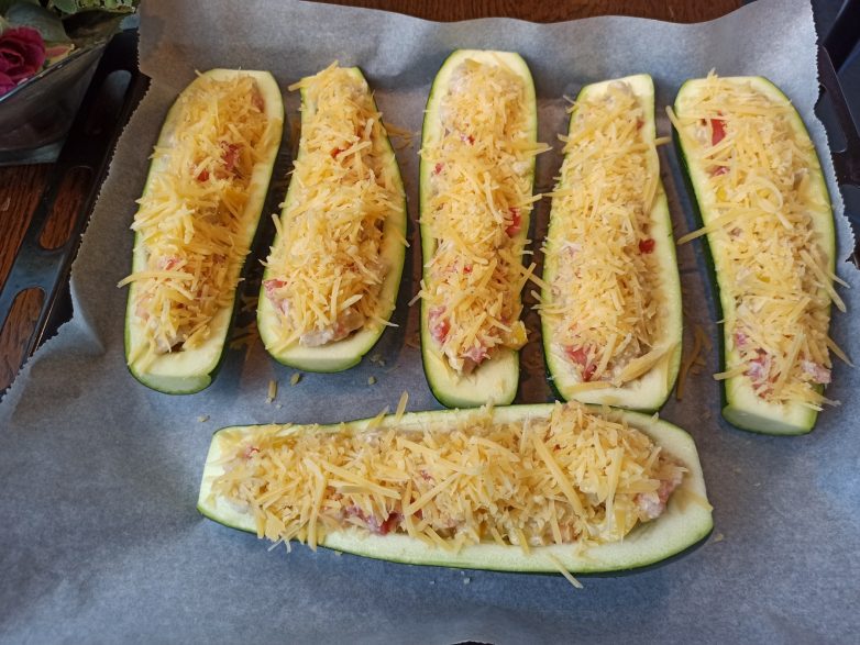 5.На противень, застеленный пекарской бумагой, укладываем «лодочки». Наполним приготовленной начинкой.Сверху посыпаем тертым сыром.