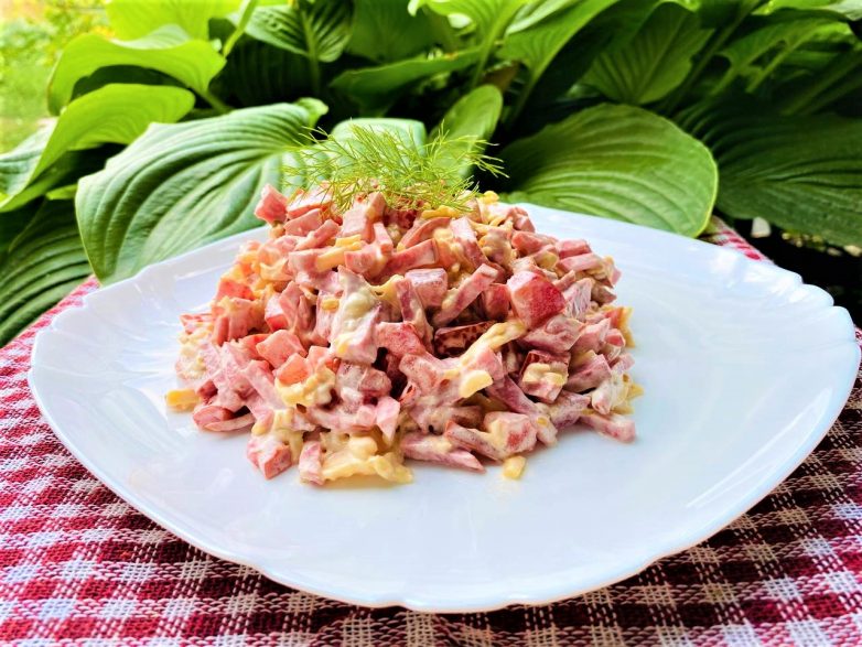 Простой, вкусный, хрустящий салат из обычных продуктов! Салат с колбасой, помидорами и сыром готовится очень быстро, для его приготовления ничего варить не нужно.