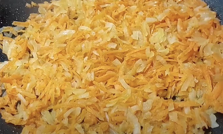 Капусту всего на пару минут опускаем в кипящую воду. Теперь разобрать ее на листья будет совсем просто, листья же останутся эластичными. Затем разогреваем в сковороде немного растительного масла. Первым обжариваем мелко нарезанный лук, через 1 минуту добавляем к нему пропущенную через терку морковь и нарезанный кубиками болгарский перец. Накрываем крышкой и тушим овощи до мягкости на огне чуть ниже среднего.