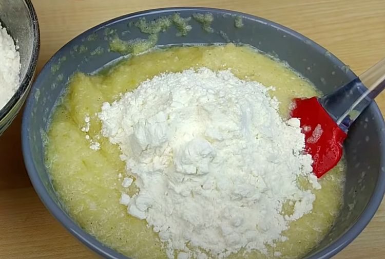 Заключительным шагом засыпаем муку и получаем готовую массу для оладьев.