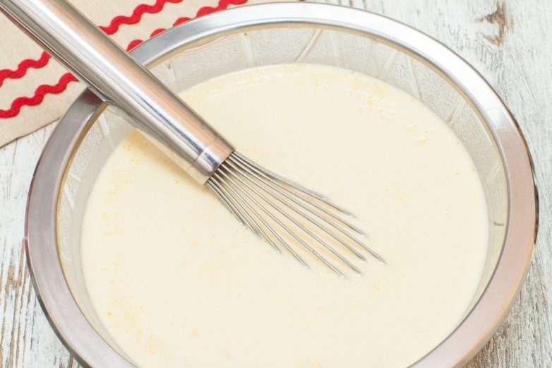 Для данного рецепта будем использовать стакан объемом 200 мл. В небольшую миску отмеряем и высыпаем муку и разрыхлитель. Хорошо перемешиваем ингредиенты.