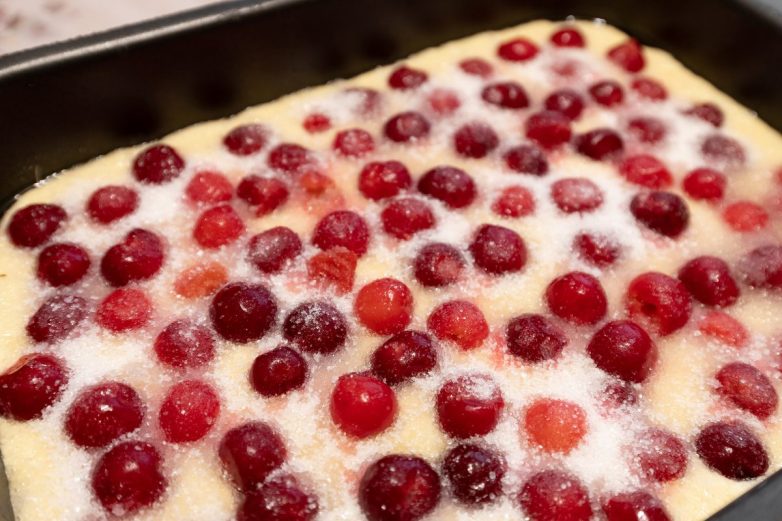 В конце вливаем в силиконовую форму вторую часть теста. Выравниваем ложкой, чтобы все ягоды были покрыты.
