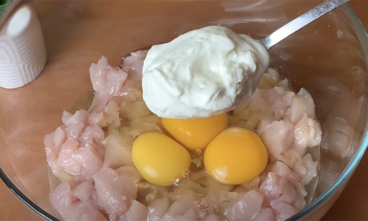 Куриное филе промываем и нарезаем очень мелко в глубокую миску. Сюда же разбиваем яйца, добавляем сметану, черный перец, чеснок, соль и муку. Затем шинкуем сюда же укроп, натираем на мелкой терке сыр.