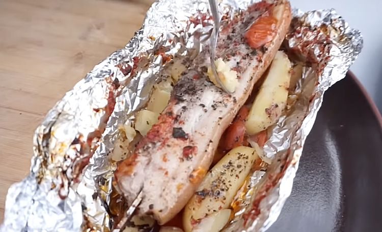 Шашлык в фольге с добавлением овощных ингредиентов. При таком способе мясо пропекается равномернее, сохраняя весь сок и напитывая им то, что позже станет гарниром.
