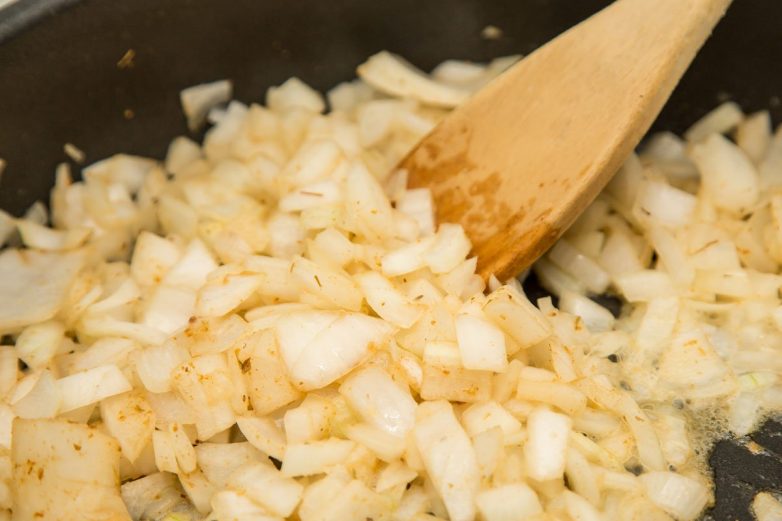 Нарезаем лук и поджариваем его на сливочном масле. Затем отправляем к пюре.