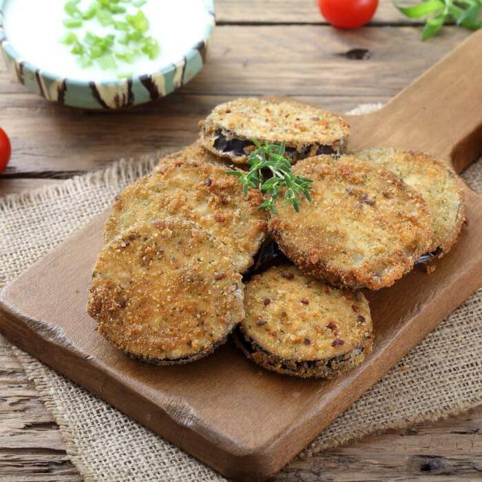 • Кружки баклажанов обвалять в яичной смеси, после как следует в сырной;