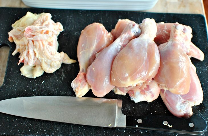 Восхитительно хрустящая корочка цыпленка безусловно хороша, если речь идет о гриле или запекании в духовке. Но при долгом томлении она станет просто резиновой безвкусной шкуркой, которая не украсит ваше блюдо, а будет неаппетитно всплывать среди румяных овощей.