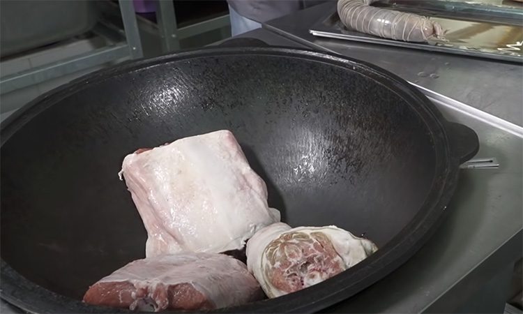 Бешбармак удобнее всего готовить в казане и сразу большими порциями. В этом есть смысл: блюдо получается неимоверно вкусным, съедают его до крошки. Первым отправляем в казан сразу все мясо. Наливаем холодную воду. Ставим на небольшой огонь и томим мясо 3 часа. Процесс приготовления не быстрый, но и результат того стоит.