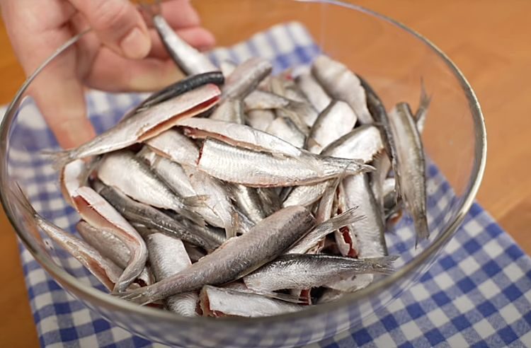 Чуть оттаявшую кильку потрошим и промываем под проточной водой.