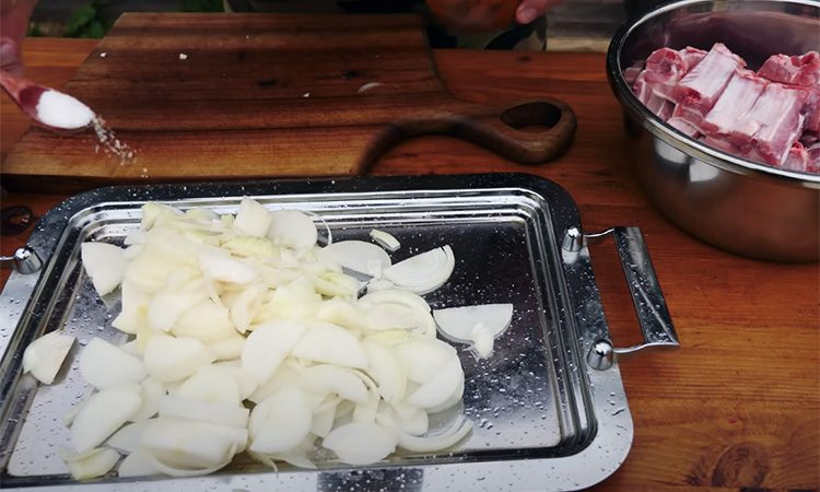 Ребра делим острым ножом так, чтобы мяса оставалось на каждом примерно равное количество. Лук шинкуем полукольцами произвольного размера в противень. Засыпаем его солью, сразу солим и ребрышки. Лук тщательно проминаем руками, чтобы выделилось как можно больше сока.