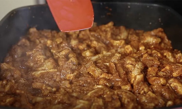 Мясо режем небольшими кусочками и обязательно тщательно промываем. Все специи пересыпаем в глубокую миску и заливаем немного воды, ставим пока в сторону. Теперь разогреваем в сковороде небольшое количество масла и начинаем тушить мясо, на огне чуть ниже среднего и под крышкой этой займет около часа.
