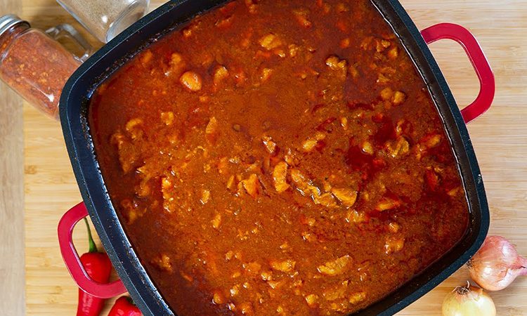 В последнюю очередь вливаем горячую воду так, чтобы она покрыла мясо на полсантиметра, не более. Через десять минут всыпаем острый чили и кладем шафран. Все перемешиваем и тушим уже до готовности, 15 минут на медленном огне.