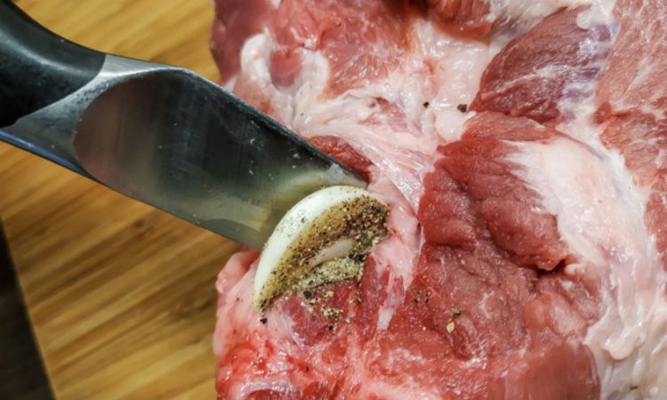Мясо обязательно промываем и просушиваем бумажными полотенцами. Теперь на тонкие пластинки режем чеснок. По всему куску мяса делаем глубокие надрезы и шпигуем его ломтиками чеснока. Затем натираем мясо солью и смесью перца с куркумой.