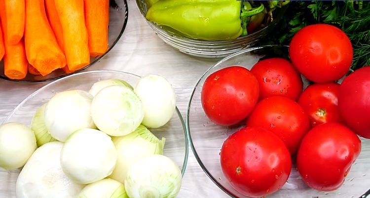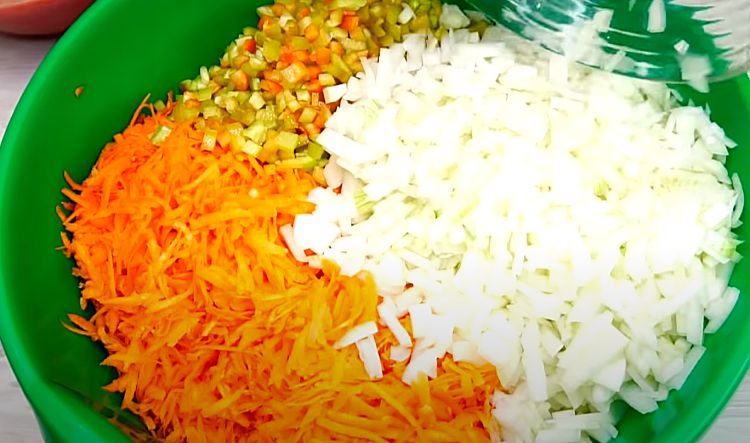 Помытые и очищенные овощи измельчаем: морковь натираем на крупной терке, перец и лук нарезаем небольшими кубиками, зелень шинкуем, помидоры измельчаем в блендере или пропускаем через мясорубку.