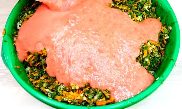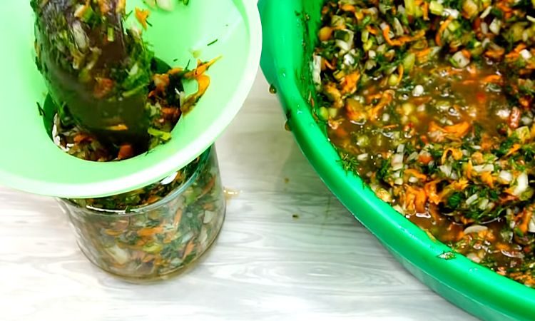 В измельченных томатах растворяем килограмм соли. Все овощи смешиваем в большой емкости, заливаем солено-томатной массой и еще раз тщательно размешиваем.