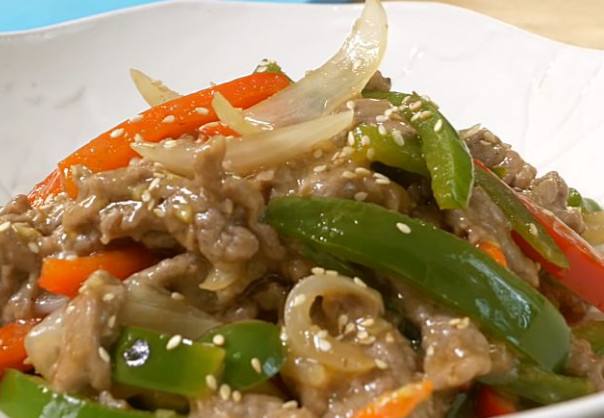 На этом мясо почти готово и оно уже стало мягким, но мы добавим к нему овощи. Режем лук, болгарский перец, добавляем имбирь, уксус и жарим их в жире от мяса.