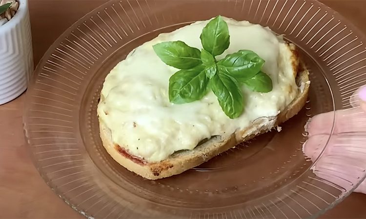 Масса получится нежной и воздушной, наносим ее на каждый кусочек хлеба и ставим на 15 минут в духовку при 190 градусах.