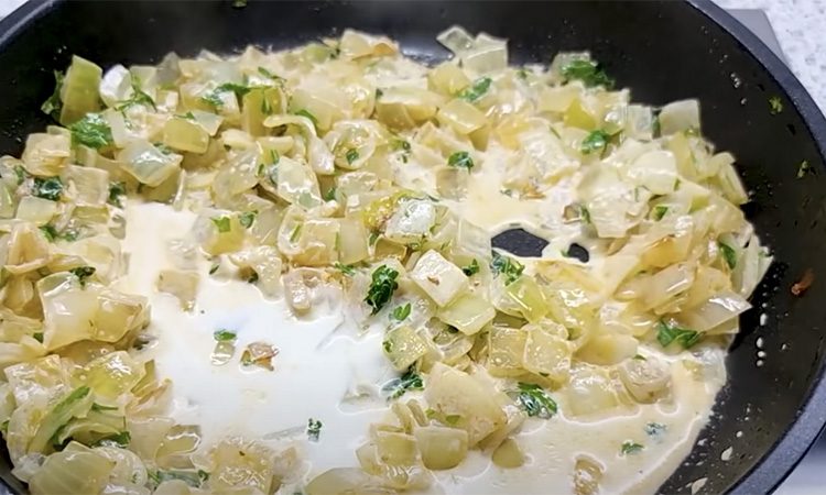 Снова разогреваем в сковороде масло, обжариваем крупно нарезанный лук и нарезанный пластинками чеснок. Затем нарезаем в сковороду зелень и вливаем 2/3 сливок.