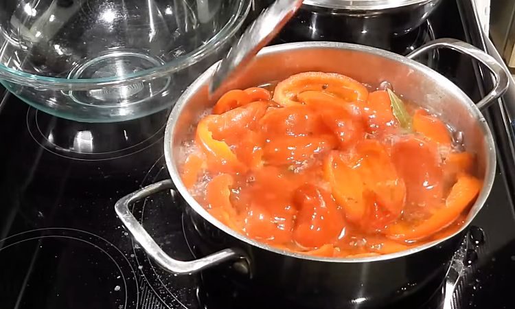 Сладкий перец очищаем от сердцевины и семян, промываем, делим на четвертинки и опускаем в закипевший маринад. Еще раз ждем пока закипит и на слабом огне под закрытой крышкой варим 3 минуты, после чего выкладываем перец, чтобы он остыл.