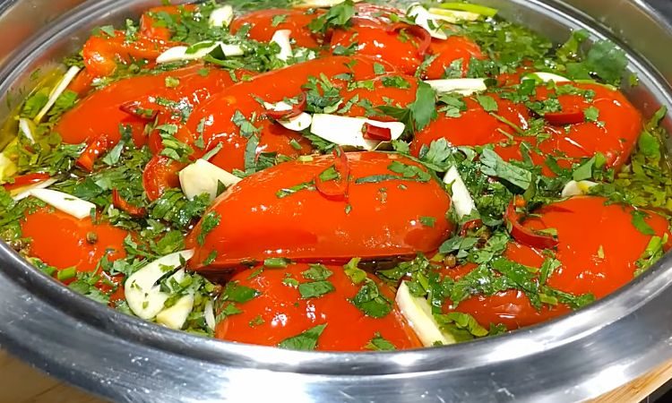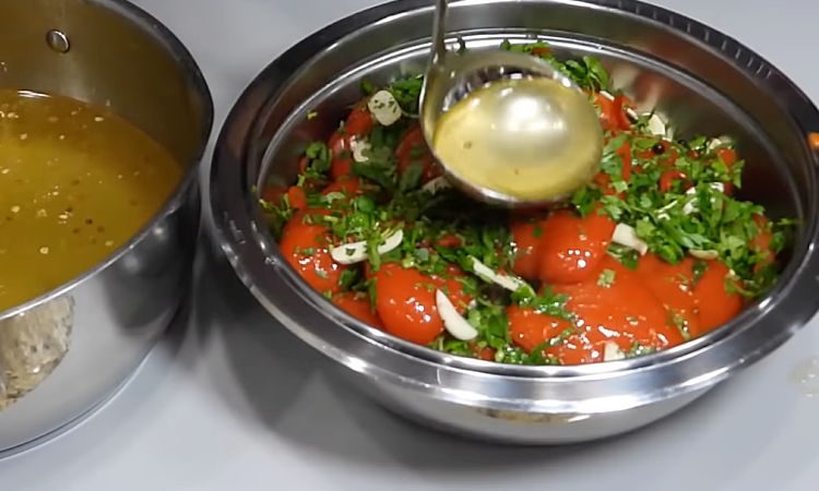 В металлической или стеклянной посуде послойно выкладываем перец, пересыпая его зеленью с чесноком и острым перцем. Заливаем все оставшимся маринадом так, чтобы он немного покрывал закуску, придавливаем тарелкой и накрываем крышкой. Остывший до комнатной температуры контейнер убираем в холодильник на 12 или больше часов.
