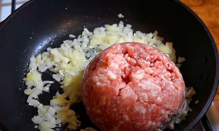 Режем мелко лук и начинаем обжаривать в масле до прозрачности. Сразу после этого добавляем фарш и смешиваем. Тушим под крышкой до готовности.