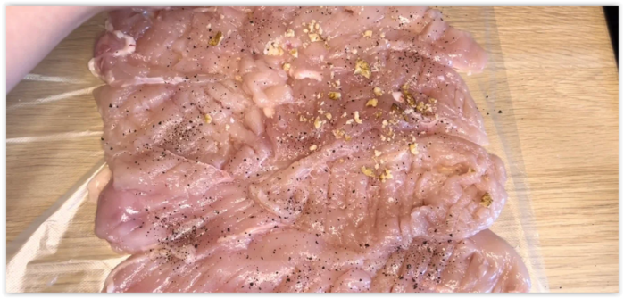 Отбиваем куриную грудку и выкладываем на пищевую пленку. Должен получиться ровный слой. Солим, перчим и добавляем грецкий орех.