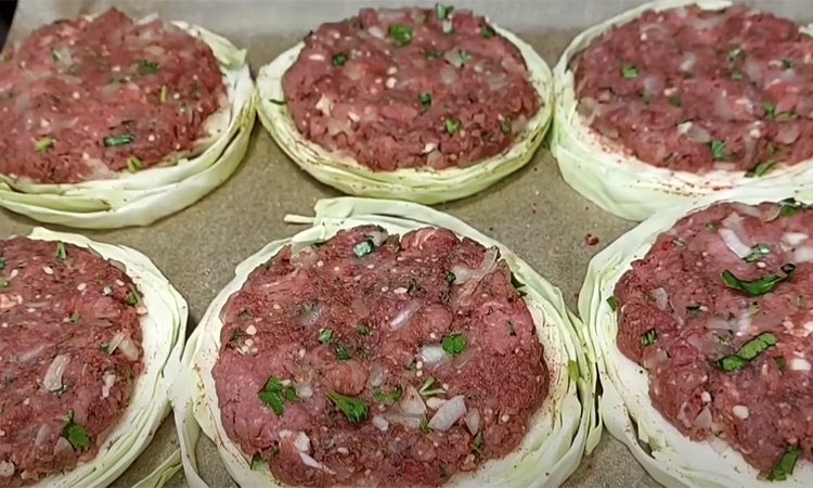 Капусту сразу режем крупными шайбами и выкладываем на застеленный пергаментом противень. Присыпаем копченой паприкой, солью и перцем. В отдельной миске смешиваем в однородную массу фарш, мелкооптовой нарезанный лук, специи и соль. Получившуюся смесь выкладываем порционно на капусту.