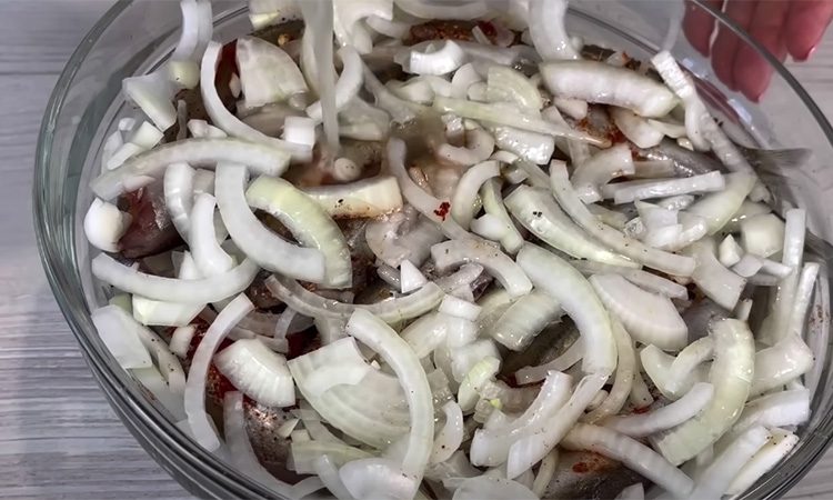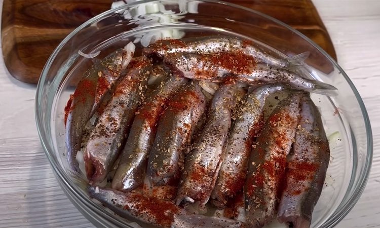 Мойву чистим внутри, убираем головы. Хвостики можно оставить. Теперь шинкуем крупно лук и выкладываем его первым слоем в глубокую миску. Сверху раскладываем рыбу, засыпаем смесью специй. Снова кладем лук, снова мойву и опять накрываем луком.