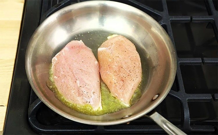 Как только курица дошла до кондиции, нам выкладываем ее отдохнуть и переходим к соусу. Бульон уже уварился, поэтому добавим к нему немного лимонного сока и сливочного масла. Увеличиваем огонь и ждем, когда масло начнет закипать и образовывать пузырьки. Соус стал гуще — это то, что нам требуется.