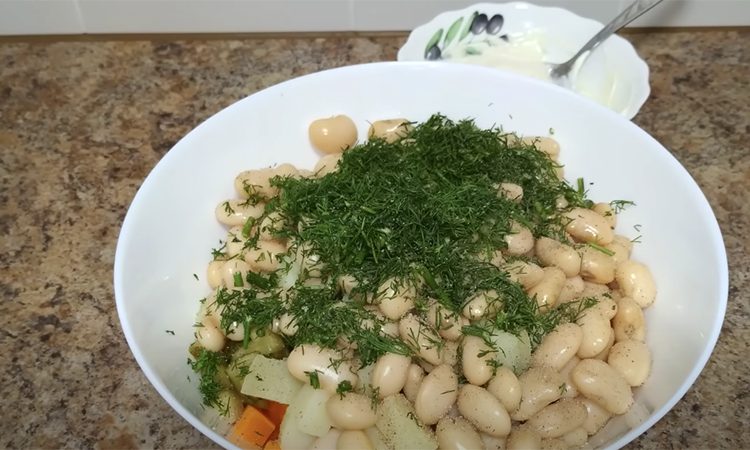 Выкладываем фасоль, шинкуем мелко укроп. В отдельной емкости смешиваем майонез, сметану, соль и перец. Получившимся соусом заправляем салат и перемешиваем.