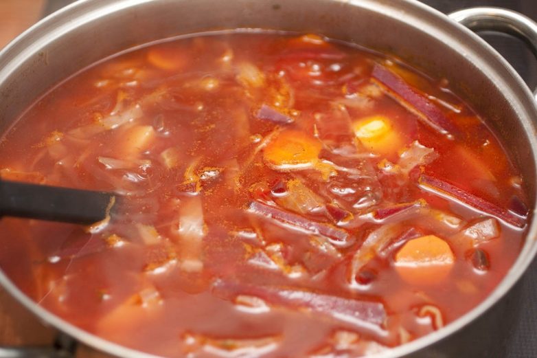 Когда мясо сварится, добавь в кастрюлю нарезанную морковь, нашинкованную свежую капусту и тушеную свеклу. Всё это вари примерно 10 минут.