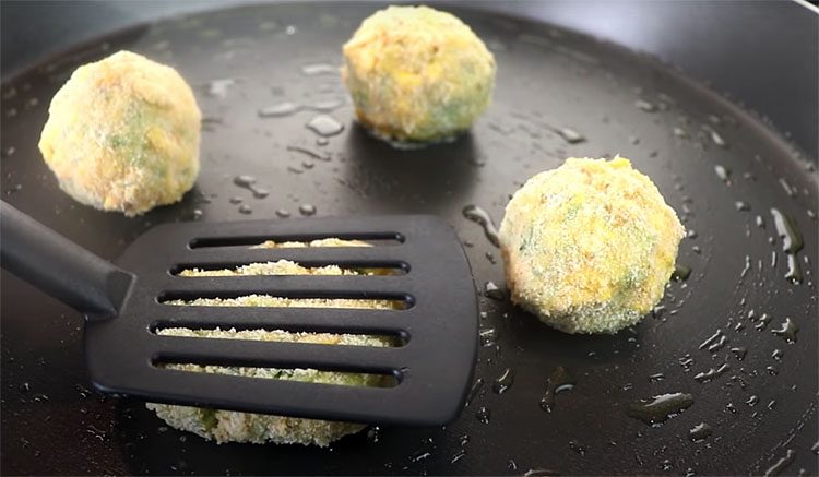 Получившуюся смесь скатываем в аккуратные шарики, обмакиваем в панировочные сухари и жарим до готовности.