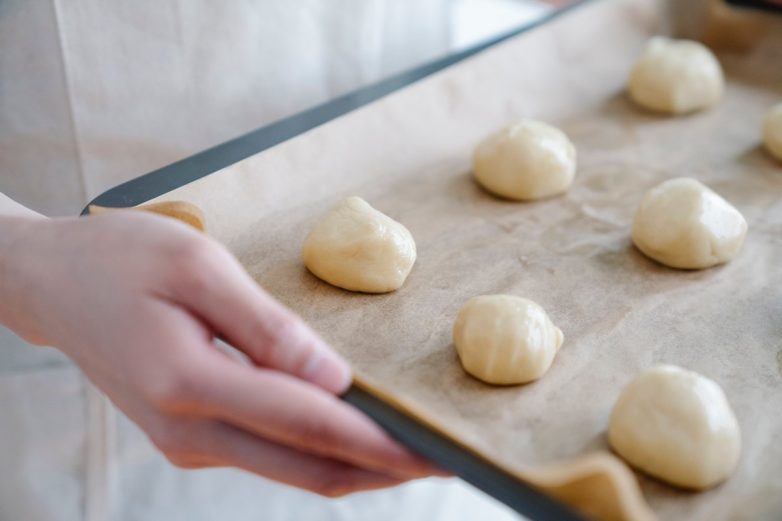 Как только тесто настоится, начинай формировать из него 12 одинаковых шариков. Выкладывай их на сухую и чистую сковородку. Прикрой сковородку крышкой и дай настояться выпечке еще 20 минут. После этого можно ставить пампушки на минимальный огонь.