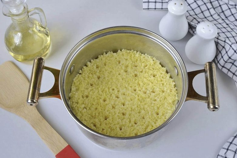Сперва займемся крупой. Промой пшено несколько раз под проточной водой, пока она не станет прозрачной. Затем залей кашу кипятком и дай ей полчаса постоять. Это нужно, чтобы из пшена вышла вся горечь. Затем слей воду.