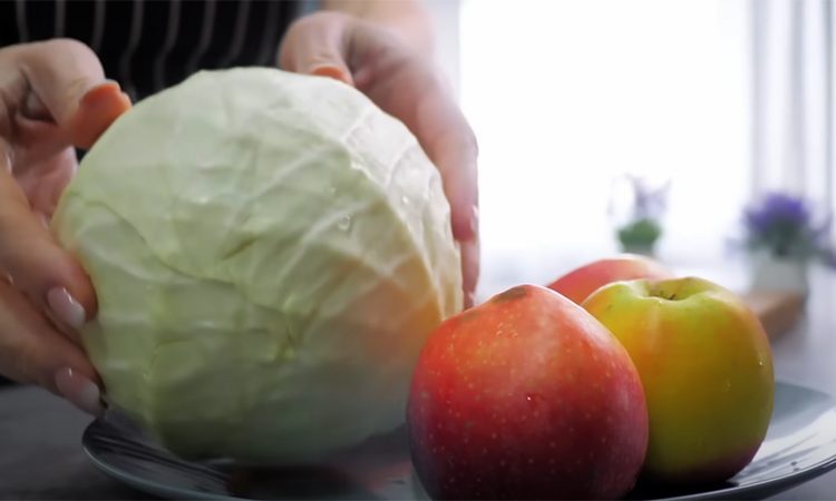 Капусту мелко шинкуем в глубокую миску. Добавляем к ней соль и проминаем, затем сюда же на терке натираем морковь и мелким кубиком нарезаем луковицу. Следом нарезаем небольшими ломтиками яблоки и кубиками режем к капусте курицу.