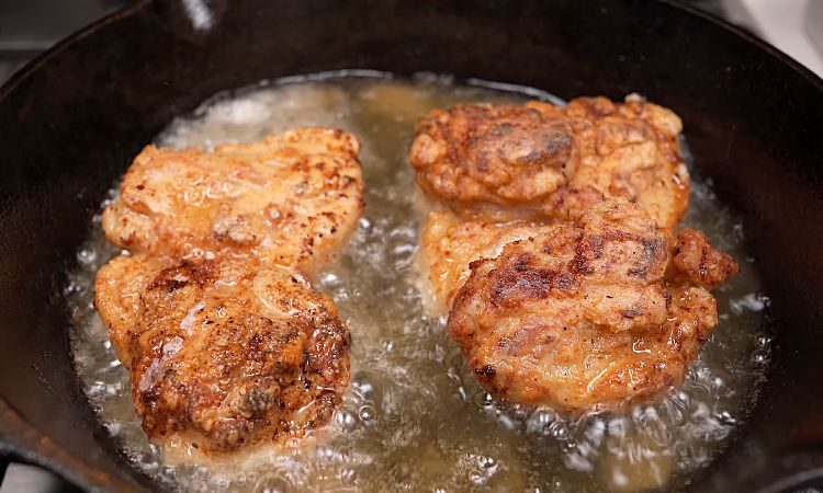 Перекладываем курицу в дуршлаг и даем стечь остаткам маринада. Каждый кусок тщательно вываливаем в муке со специями после чего опускаем в раскаленное масло на сковороде. Обжариваем по 3 минуты: с одной, с другой и снова с первой стороны. Всего по 9-10 минут на каждый кусок.