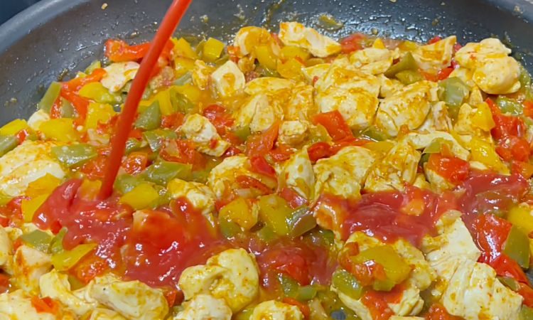 Куриное филе нарезаем и выкладываем к овощам, солим, перчим, добавляем паприку и карри (либо ваши любимые приправы), вливаем томатную пасту, перемешиваем и тушим несколько минут под закрытой крышкой.