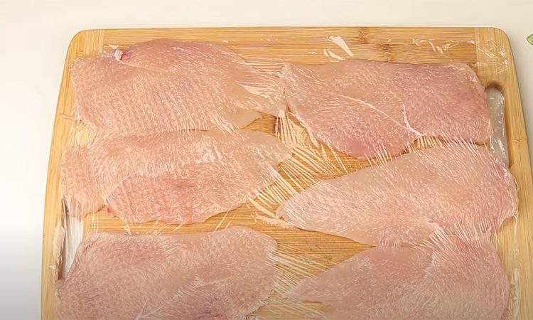 Курицу промываем и каждое филе режем пополам вдоль волокон. Затем перекладываем заготовки на рабочую поверхность, накрываем пищевой пленкой и слегка отбиваем молотком. Солим филе и перчим, переносим его в глубокую миску. Добавляем растительное масло, перемешиваем и оставляем чуть промариноваться, 20 минут хватит.