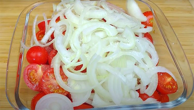 Кладем готовые помидоры в миску для маринования. Сверху добавляем лук полукольцами.