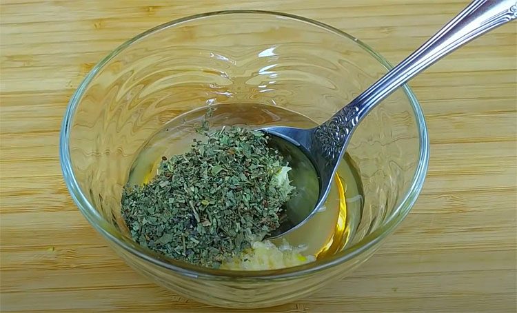 Солим, перемешиваем и приступаем к маринаду из меда и специй. Смешиваем растительное масло, мед, лимонный сок, натертый на мелкой терке чеснок, сушеный базилик и перец.